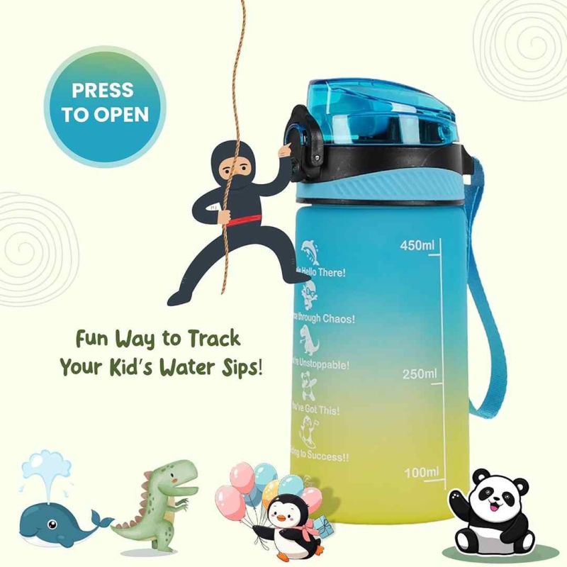 The SOLARA 500 ml Kids Tritan Water Bottle in Yellow Blue is designed for children aged 2–8 years. Lightweight, durable, and leakproof, it features a soft silicone straw, locking lid, wide neck, and a dust-proof cap. Motivational time markers with fun characters make hydration exciting for kids. Perfect for school, home, outdoor play, sports, and travel.