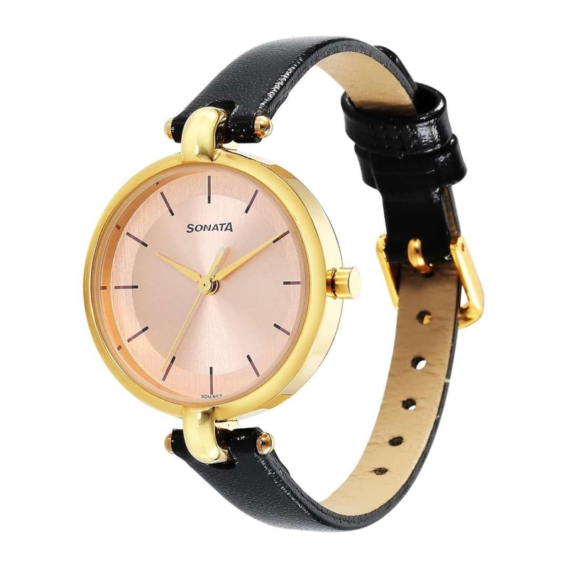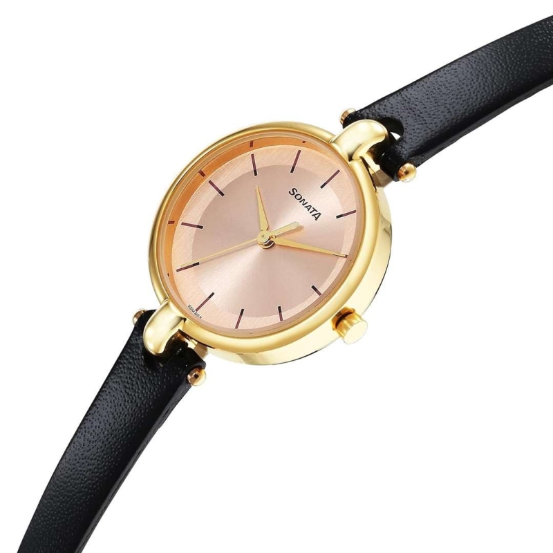 Elevate your everyday style with the Sonata Gold Edit 2 women's analog watch. Designed with a warm champagne dial, it features minimalistic stick hour markers with subtle dot accents, creating a sleek and contemporary aesthetic. The gold-tone case adds a touch of luxury, while the slim dark brown leather strap offers all-day comfort and timeless charm. Powered by a lithium battery, this battery-powered analog watch ensures reliability along with effortless elegance. Whether you’re dressing for work or a casual outing, the Sonata Gold Edit 2 is the perfect blend of modern sophistication and classic grace.