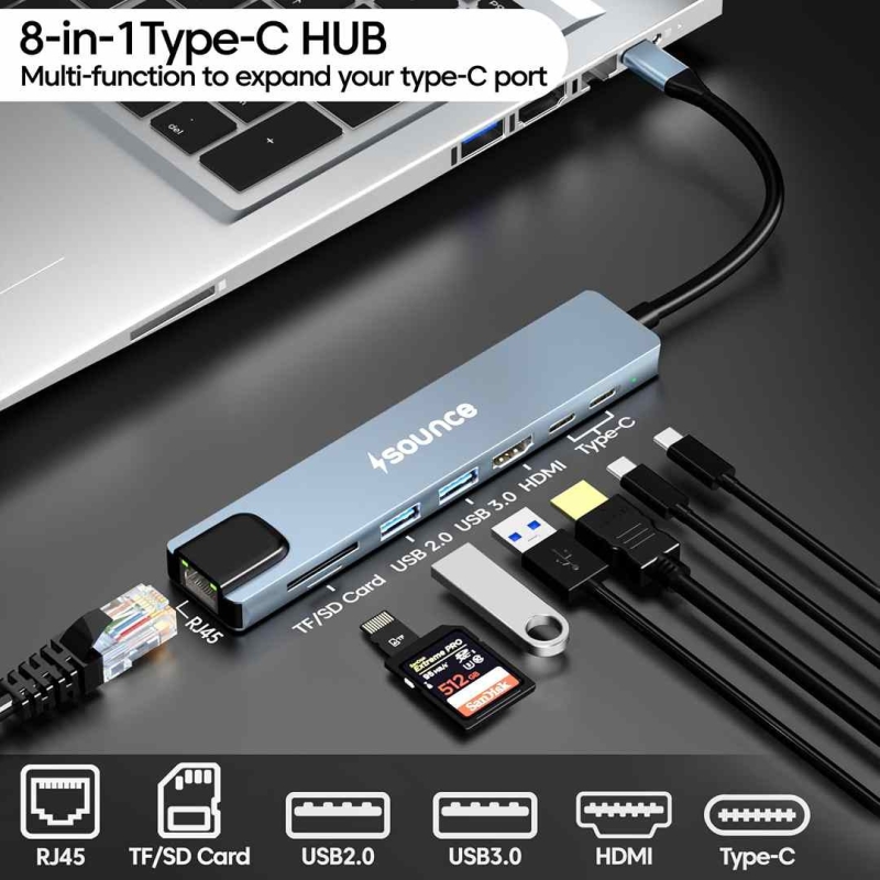 The Sounce 8-in-1 USB-C Multiport Hub (SNC-HBDC8-1) is a lightweight and plug-and-play connectivity solution that transforms USB-C devices into a complete workstation. It features 4K HDMI output, SuperSpeed USB 3.0 data transfer, 100W USB-C Power Delivery, and a 100Mbps Ethernet port, making it ideal for professionals, students, and entertainment enthusiasts who need reliable performance at home, in the office, or on the go.