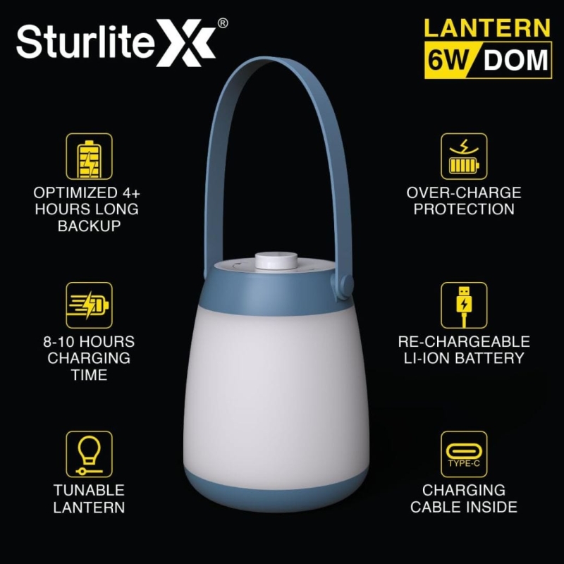 The Sturlite Dom LED Lantern is a lightweight, multicolor emergency light designed for versatility and portability. With adjustable color temperatures (3500K–6500K), a soft glare-free light, and wide coverage optics, it's perfect for both indoor and outdoor use. The built-in 2000mAh rechargeable lithium-ion battery offers up to 4 hours of backup with an 8-hour charge time via a convenient Type-C port. Made from durable polycarbonate, this compact lantern is travel-friendly and user-friendly with its rotatory knob control.