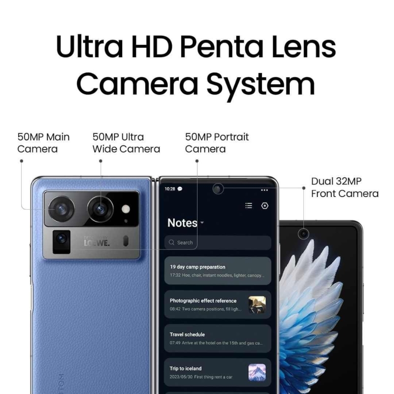 The Tecno Foldable Smartphone (2024, Rippling Blue) combines cutting-edge performance with premium durability. Featuring a 7.85" 120Hz AMOLED main screen and a 6.42" curved cover display, it delivers immersive visuals for gaming, entertainment, and productivity. Powered by a flagship 9000+ processor, 12GB RAM, and 512GB storage, it handles multitasking effortlessly. Its Ultra-HD Penta camera system with a 50MP main sensor captures stunning photos, while a massive 5750mAh battery with fast and wireless charging keeps you powered all day. Durable, water-resistant, and compatible with stylus input, this smartphone is ideal for business, entertainment, gaming, and photography enthusiasts.