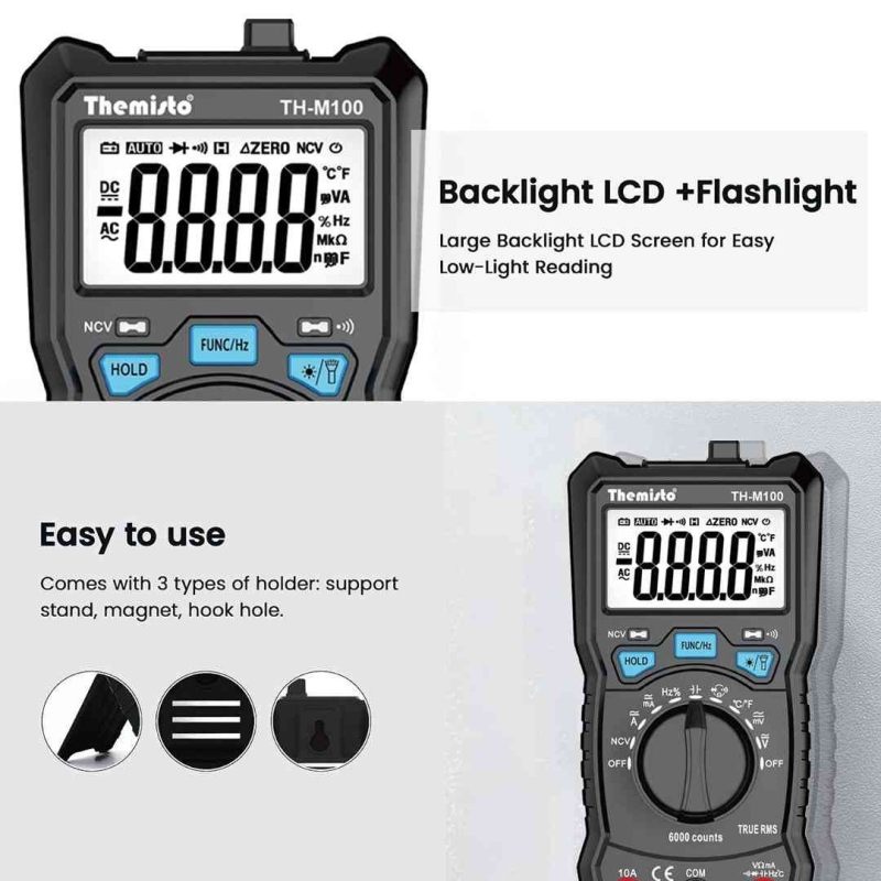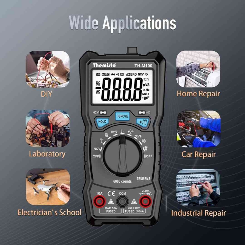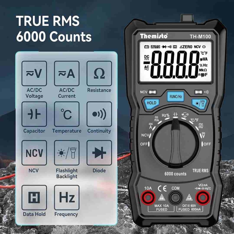 The THEMISTO TH-M100 Digital Multimeter is a compact, True RMS meter designed for accurate and reliable electrical testing. With 6000 counts, NCV detection, backlit display, and support for voltage, current, capacitance, temperature, frequency, and more, it’s ideal for technicians, electricians, and DIY users.