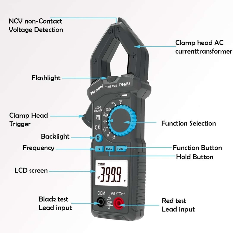 The THEMISTO TH-M88 is a compact and reliable True-RMS clamp meter designed for accurate electrical measurements in labs, factories, and households. It supports AC current, AC/DC voltage, resistance, capacitance, diode, and continuity testing, along with NCV detection, a hold function, and a built-in LED flashlight. Built to IEC 61010-1 CAT III 600V safety standards, it ensures safe and dependable operation.