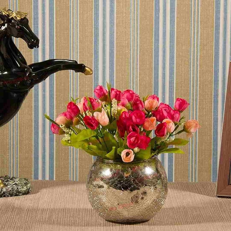 Add a vibrant touch to your home with this TIED RIBBONS Crackled Glass Vase with 2 artificial silk flower bunches. Perfect as a standalone décor piece or a table centerpiece, it suits bedrooms, living rooms, and offices while making an ideal gift for weddings, birthdays, or housewarmings.