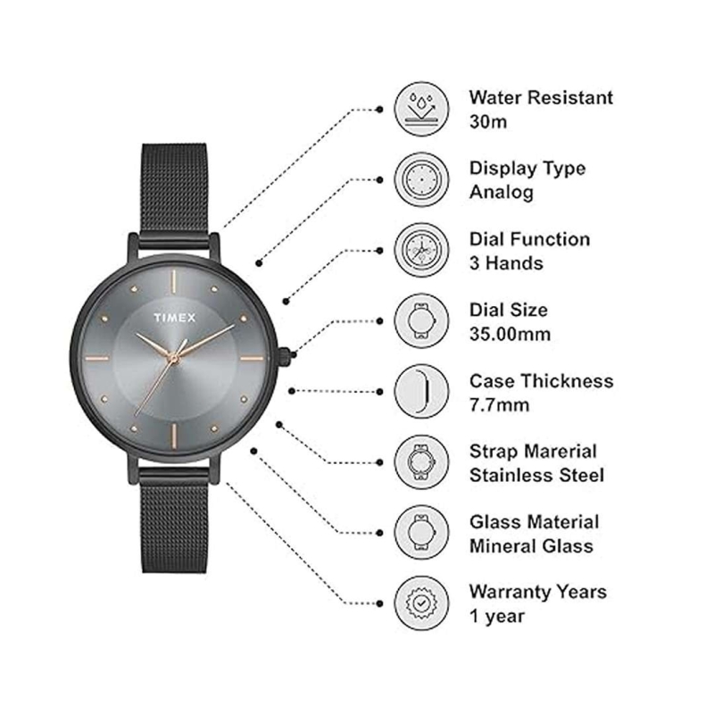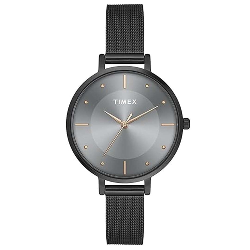 The Timex TWEL155SMU12 is a sleek and modern women’s analog watch, featuring a bold grey dial and black stainless steel band. With a day display, open dial design, and 30 meters water resistance, it combines daily functionality with a fashionable look.