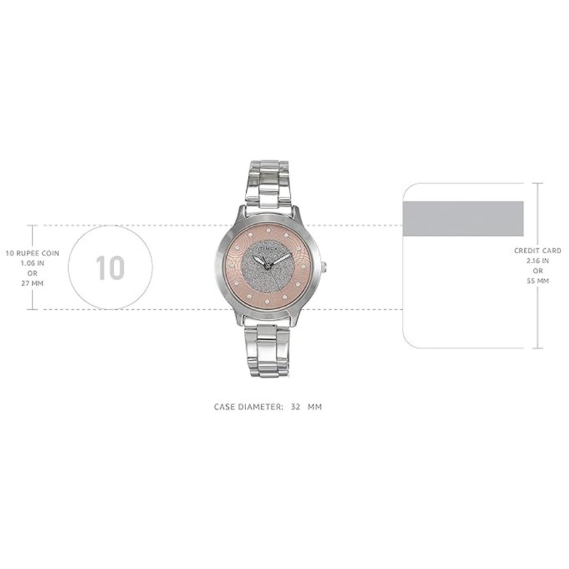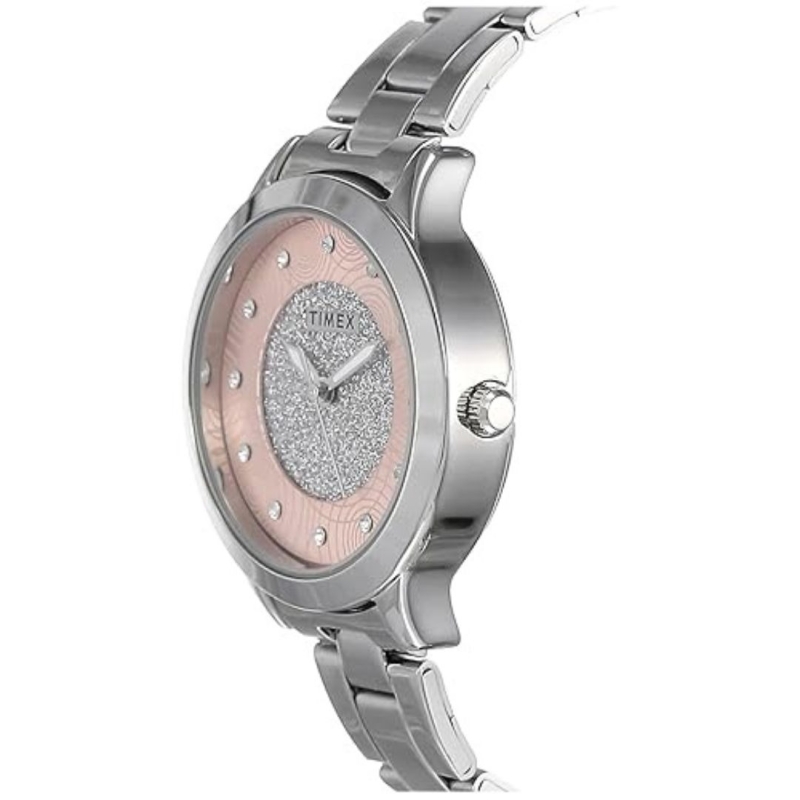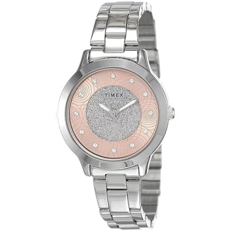 The Timex TW000T613 is a graceful women’s analog watch featuring a silver stainless steel band, pink dial, and classic round design. Equipped with chronograph, glow-in-the-dark features, and water resistance up to 30 meters, it offers both elegance and everyday practicality.