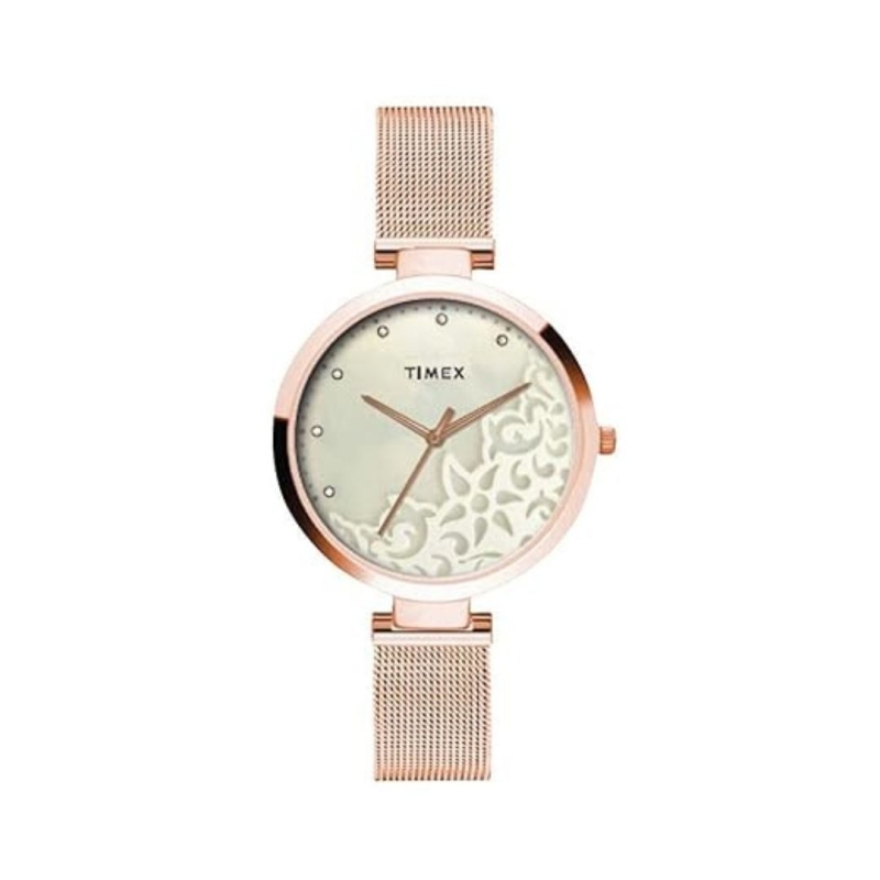 Stylish and reliable, the Timex TW000X220 is a women's analog watch featuring a rose gold stainless steel band and silver dial. With chronograph functionality, water resistance, and a sleek sliding clasp, it's a perfect blend of elegance and everyday durability.