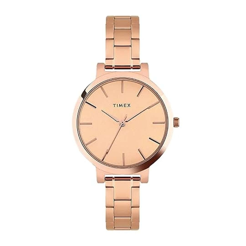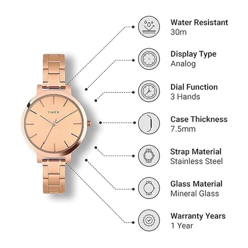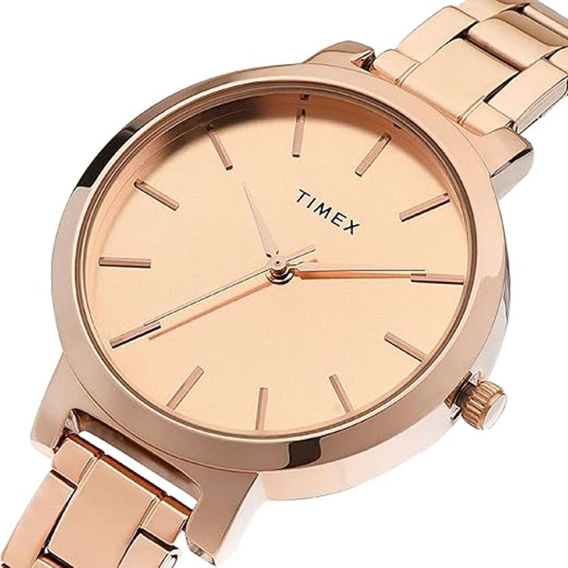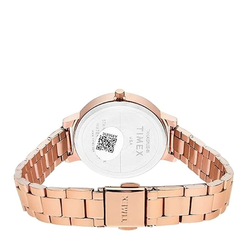 Elegant and versatile, the Timex TWHL41SMU05 analog watch features a rose gold stainless steel strap, a sleek round dial, and high-contrast hands for easy readability. With quartz movement, a date display, and water resistance up to 30 meters, this watch combines luxury with daily utility.