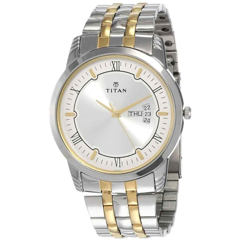 The Titan Karishma NR1774BM01 is an elegant men’s analog wristwatch featuring a classic silver dial encased in a round brass body with a durable mineral glass. Paired with a stylish gold stainless steel band, the watch is equipped with quartz movement and offers water resistance up to 30 meters. With its day-date calendar feature and 24-month manufacturer warranty, this timepiece blends functionality with refined aesthetics — ideal for everyday wear or formal occasions.