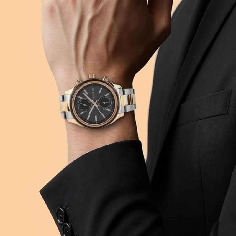 This elegant watch boasts a 48mm brass case with a rose gold metal band. The round dial features a silver color, protected by mineral glass for durability. Powered by quartz movement, the watch offers an analog display and has a water resistance depth of 50 meters. With a buckle clasp, it ensures a secure fit and comes with a 24-month manufacturer warranty against manufacturing defects. It is manufactured by Titan and packed by Shoppers Stop. This stylish timepiece is made in India.