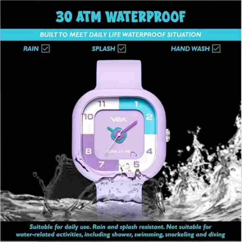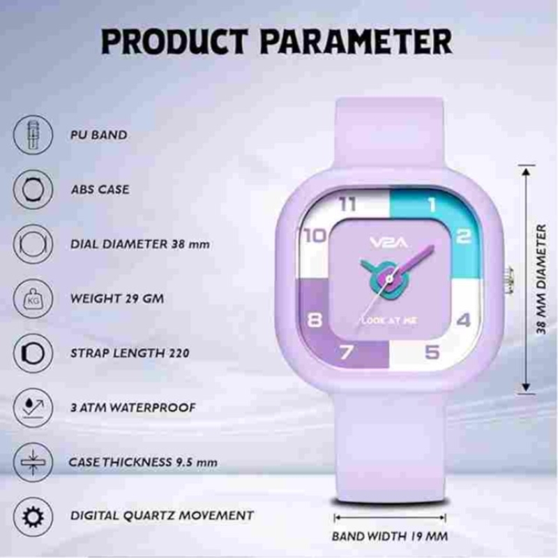 The V2A is a cute and durable kids' watch designed for children aged 4-13 years. Featuring a square dial with color scheme and a comfortable resin band, this watch is water-resistant up to 30 meters, making it perfect for daily activities and outdoor play. The adjustable strap ensures a snug and secure fit for kids of different sizes.