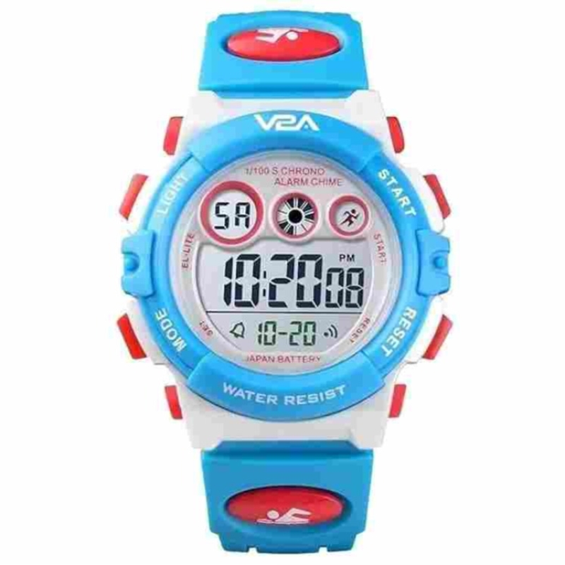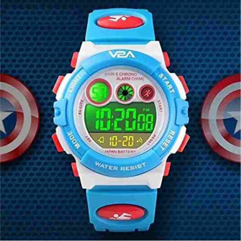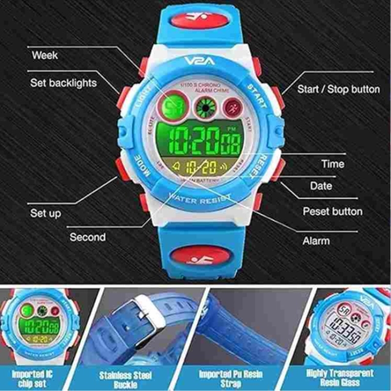 This kids' sports watch with a black resin band is designed for children aged 4 to 13. Featuring a sporty dial design, it includes useful features like a stopwatch, alarm, auto-date, 50m waterproofing, and a seven-color LED backlight. It's a fun and practical gift that helps kids develop good time management skills and is durable enough for outdoor activities like swimming.
