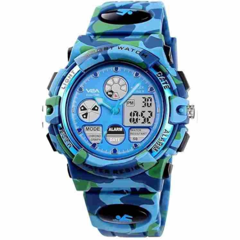 The V2A 1163 is a stylish and durable sports watch designed for kids aged 6-14 years. Featuring a bright yellow resin band, this watch includes a range of useful features like a stopwatch, backlight, calendar, alarm, and a 50-meter waterproof rating, making it perfect for outdoor activities and daily wear.