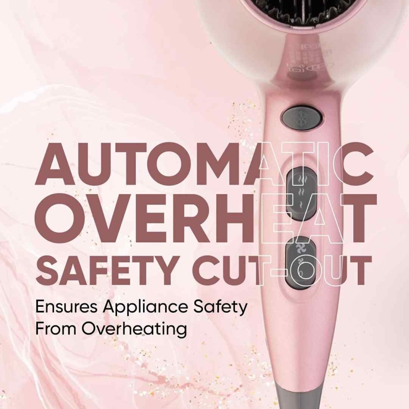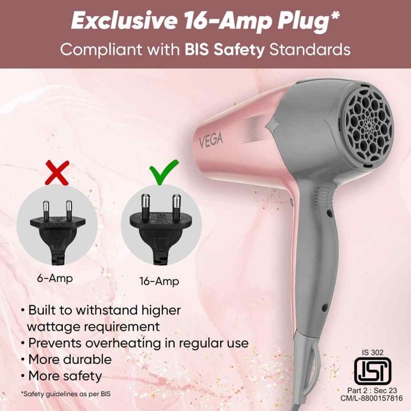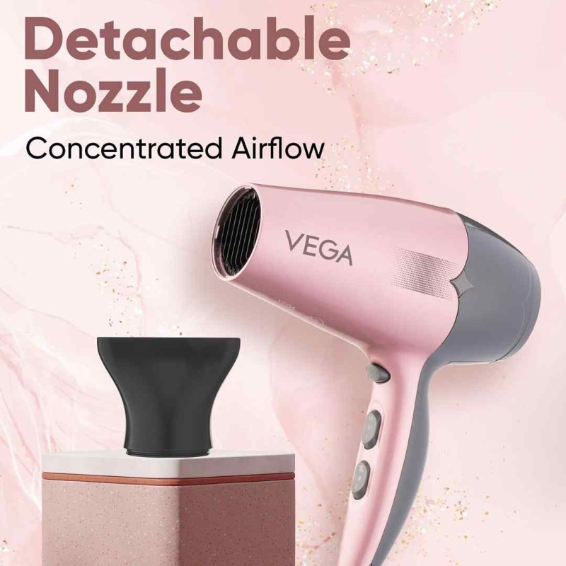 The VEGA VHDH-25 Hair Dryer (Rose Gold & Grey, 2100W) is a powerful and stylish hair dryer built for fast, salon-quality results at home. Equipped with a high-performance 1800–2100W motor, 3 heat and 2 speed settings, and a ceramic-coated grille for even heat distribution, it ensures safe and efficient drying. With a cool shot button, automatic overheat cut-out, and a detachable concentrator nozzle, this hair dryer delivers professional styling with frizz control, shine, and lasting hold.