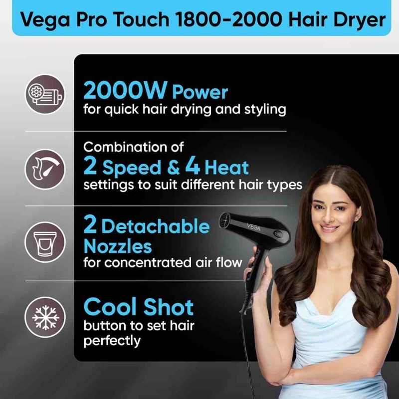 The VEGA VHDP-02 Hair Dryer (Black, 2000W) is a professional-grade styling tool designed for fast, efficient drying and salon-like results at home. Featuring a powerful 1800–2000W motor, 2 heat and 2 speed settings, and a cool shot button for long-lasting hold, it caters to all hair types and styles. It comes with 2 detachable nozzles for precision styling, an advanced airflow system to prevent heat damage, and a lightweight ergonomic design perfect for both personal and salon use