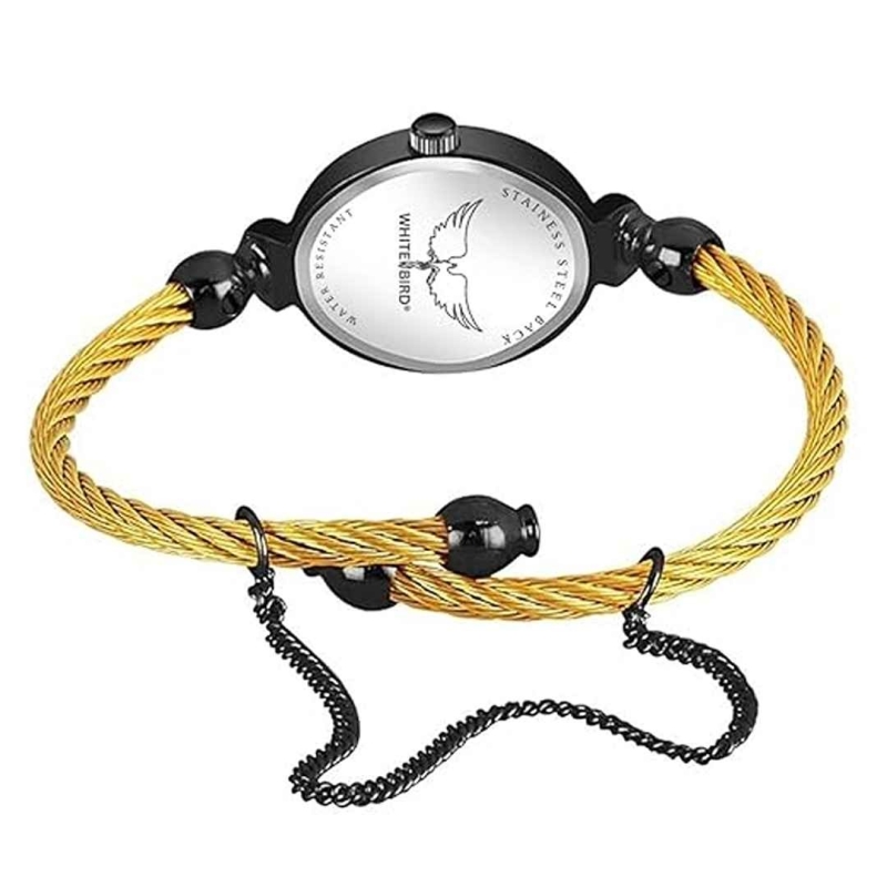 The WHITE BIRD IGP006 is a lightweight women’s casual analog watch featuring a 22.15 mm brass oval case, stainless-steel band with diamond accents, free-size comfort fit, reliable quartz movement, and 10 meters water resistance—powered by a single lithium polymer battery.