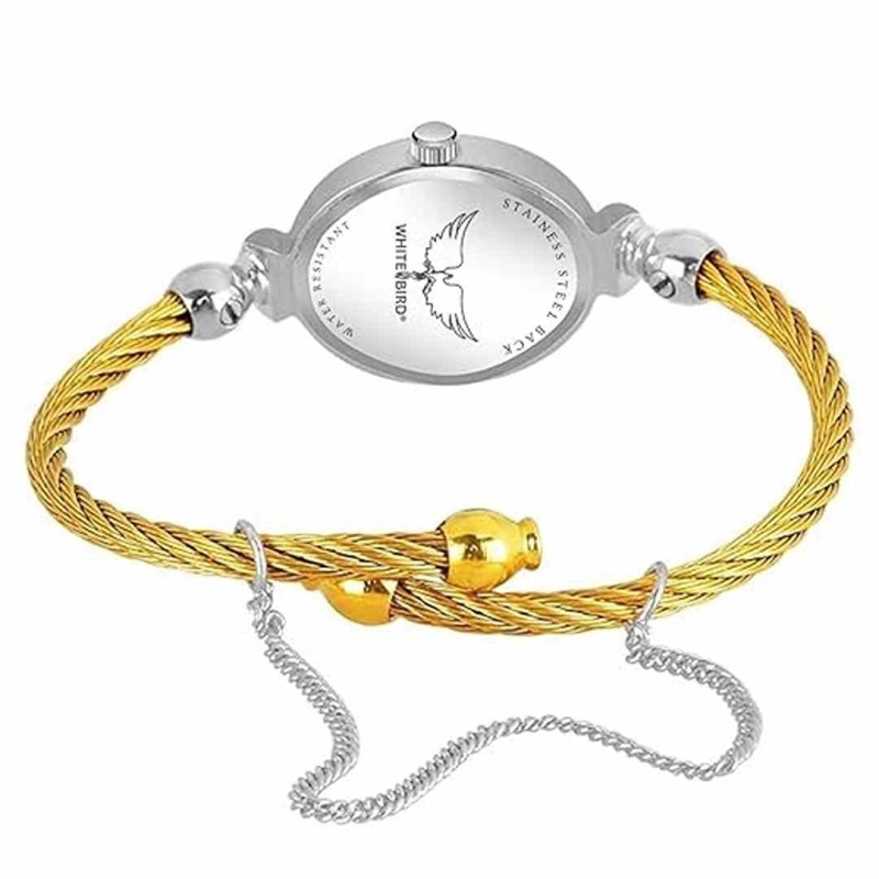 The WHITE BIRD IGP006 is a lightweight women’s casual analog watch featuring a 22.15 mm brass oval case, stainless-steel band with diamond accents, free-size comfort fit, reliable quartz movement, and 10 meters water resistance—powered by a single lithium polymer battery.