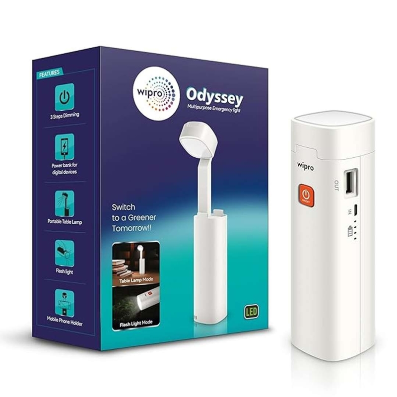 The Wipro Odyssey CL0015 is a compact and multifunctional torch cum table lamp featuring a high-quality LED light with a sharp beam and 4 lighting modes. Portable and rechargeable, it includes a 3.7V 3000mAh battery, phone holder, USB output for power bank functionality, and 3-step dimming. Ideal for indoor use, travel, emergencies, or everyday home/office lighting needs.