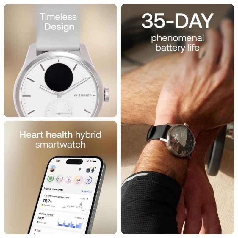 The Withings ScanWatch 2 is a feature-rich hybrid smartwatch designed to deliver medical-grade health insights alongside classic watch aesthetics. Equipped with ECG, SpO₂, GPS, heart rate, sleep, and temperature tracking, it's perfect for proactive health monitoring. With robust build quality in stainless steel and 30-day battery life, the ScanWatch 2 caters to those who value both elegance and advanced health technology.
