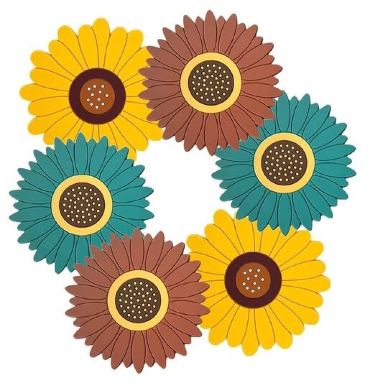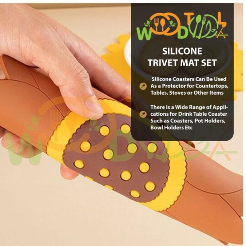 The WOODTULA Silicone Sunflower Trivet Set includes six beautifully designed, flower-shaped coasters made from flexible, durable, food-grade silicone. These multi-purpose trivets protect your dining table and kitchen surfaces from heat, cold, and spills while also adding a decorative flair. Suitable for mugs, bowls, pots, pans, dishes, and more, they are easy to clean, anti-slip, lightweight, and ideal for home, office, or restaurant use.