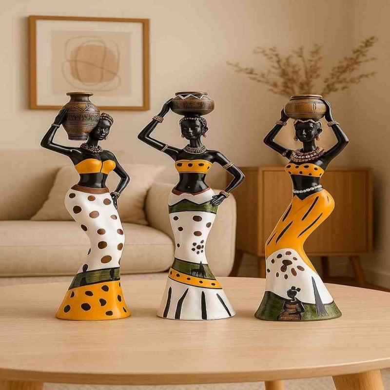 Set of 3 hand-painted resin African tribal women figurines. Perfect for indoor decoration, gifting on anniversaries or birthdays, and celebrating culture and tradition. Medium-sized, colorful, and uniquely handcrafted.