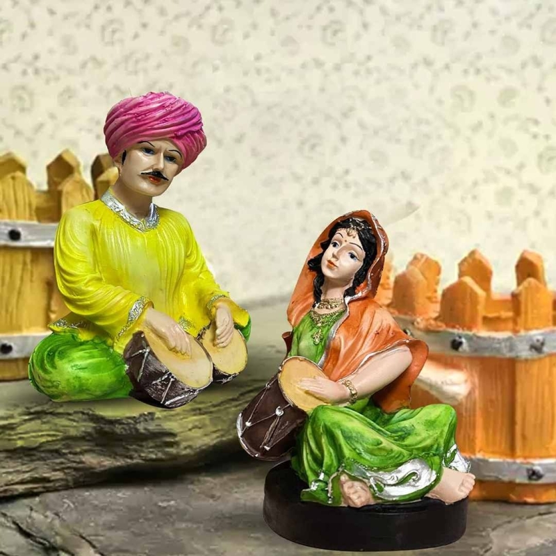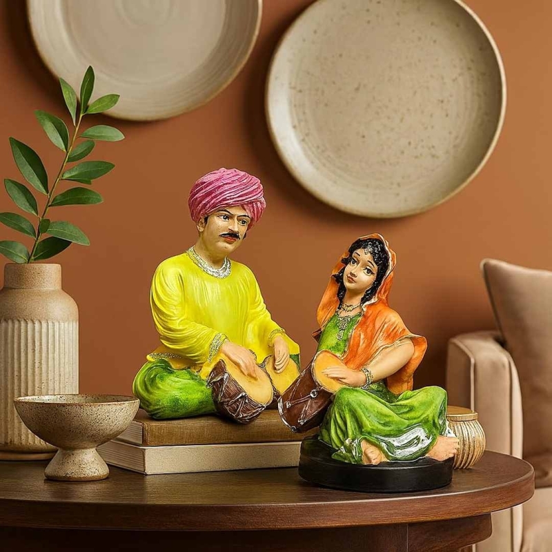 Bring traditional charm to your home with this beautifully hand-painted Rajasthani Musical Couple Showpiece by Xtore. Crafted from durable resin, this elegant décor set features a Rajasthani man and woman playing musical instruments—perfect for enhancing your living room, drawing room, or festive Diwali decorations. The vibrant colors and artistic detailing make it an eye-catching addition to any space.