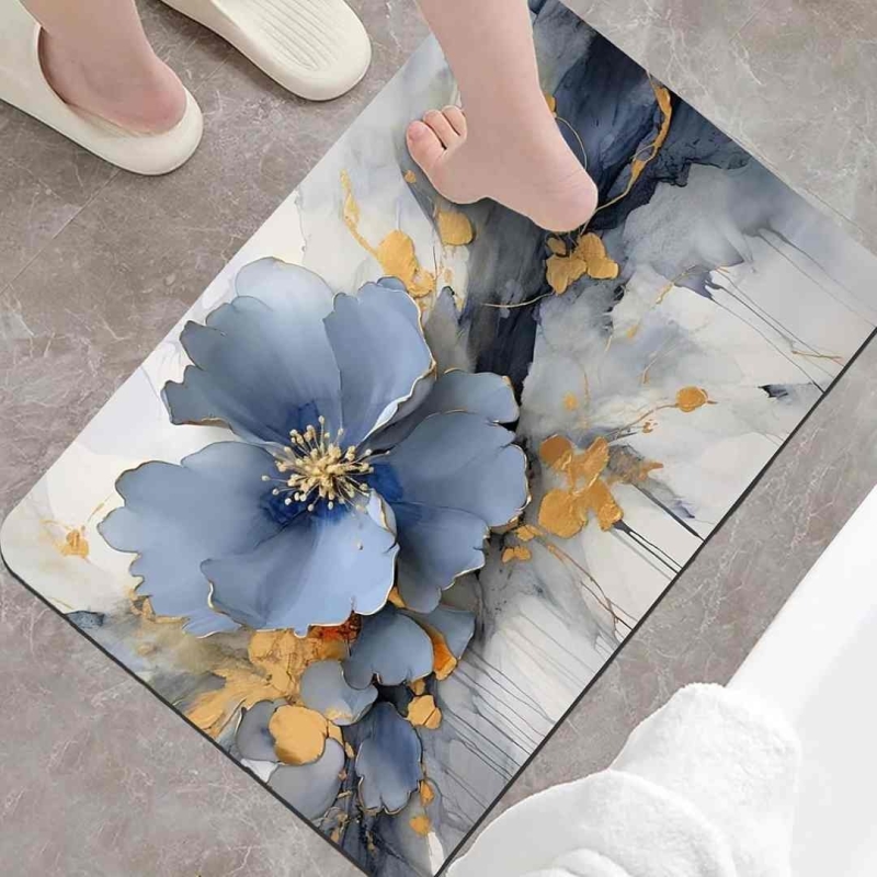 The Yellow Weaves Pack of 3 Anti-Skid Bath Mats features a 4-layer construction with a soft tech fabric top, diatomaceous earth for quick drying, a cushioning sponge layer, and a non-slip rubber bottom for safety. Designed with a 3D Blue Floral pattern, these mats absorb water instantly, prevent wet floors, resist stains, and are easy to clean through gentle machine wash. Ideal for bathrooms, bedrooms, living rooms, or as door mats, they offer both style and functionality.