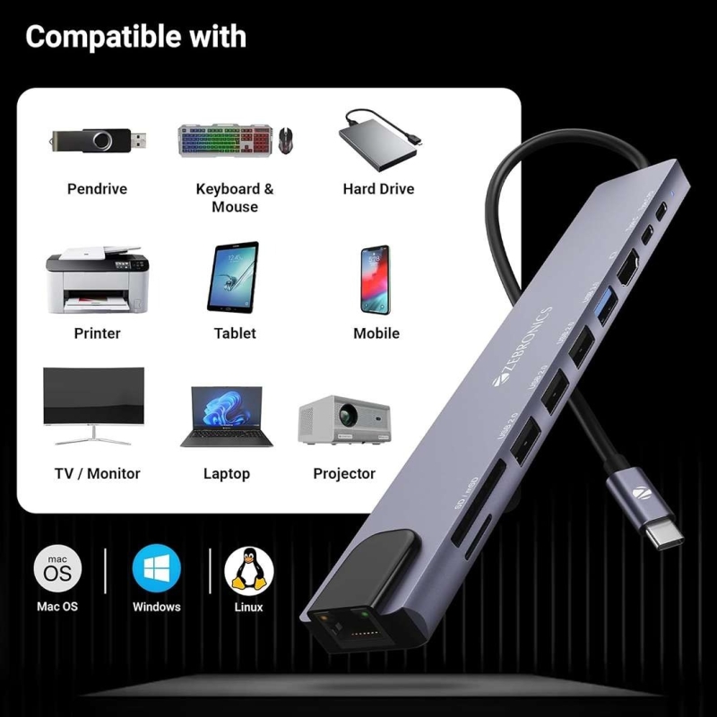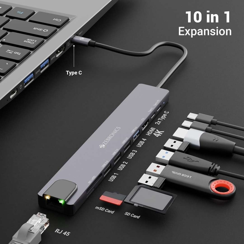 The ZEBRONICS 10-in-1 USB Hub is a sleek and compact device designed to expand your laptop’s connectivity options. It features a range of ports, including USB, HDMI, and card readers, making it an essential tool for professionals and students who need versatile and efficient connectivity. Its sturdy metal body ensures durability, while the lightweight design makes it perfect for on-the-go use.