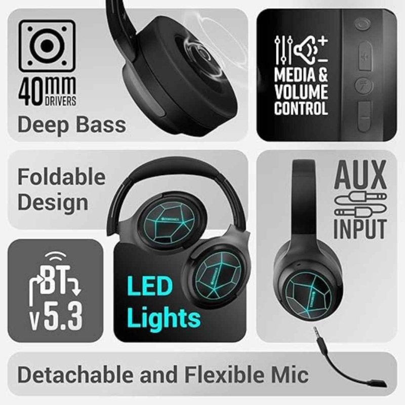 Enjoy immersive sound like never before with the ZEBRONICS Zeb-Envy 2 Over-Ear Wireless Headphones in sleek Black. Equipped with dual 40mm drivers for dynamic bass, Active Noise Cancellation (ANC), and Environmental Noise Cancellation (ENC) for calls, this headset is perfect for gaming, entertainment, and work. Featuring Bluetooth v5.3, dual pairing, a detachable mic, and up to 65 hours of playtime, it's built for ultimate performance and convenience. Ergonomic ear cushions, LED lights, and voice assistant support complete this premium audio experience.