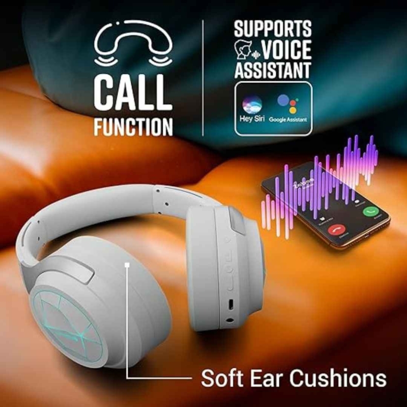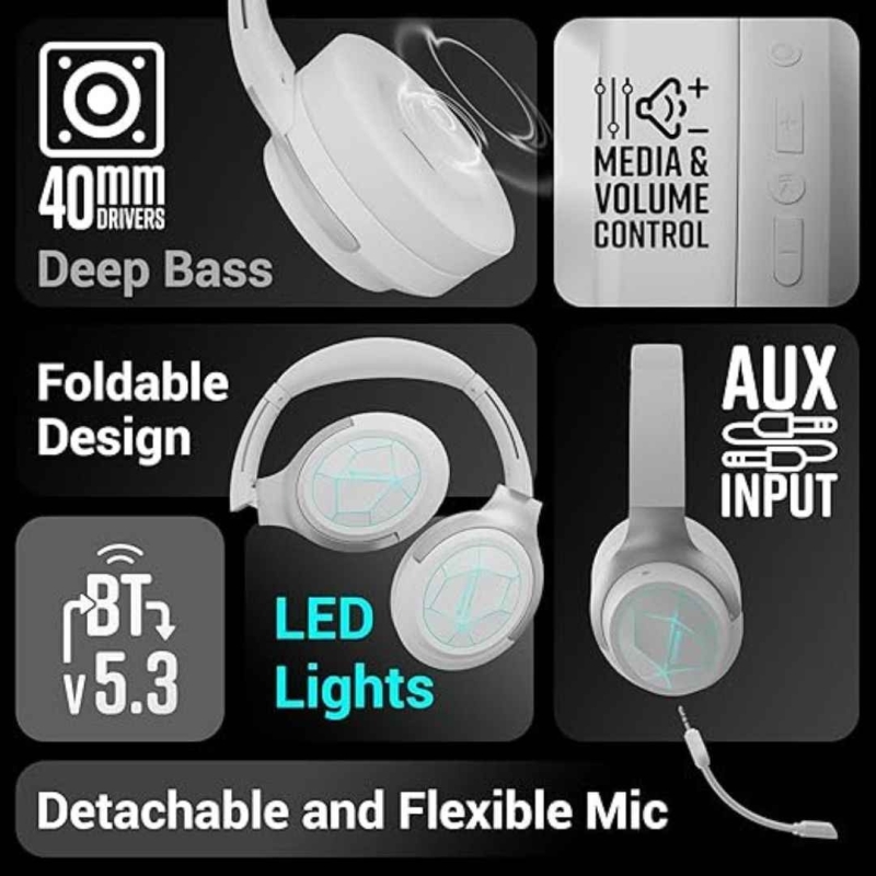 The ZEB-Envy 2 headphones provide exceptional audio with dynamic bass from dual 40mm speakers, ideal for gaming and music. Featuring Bluetooth 5.3 for wireless connectivity and an AUX option, they come with a detachable mic, making them versatile for various uses. Designed for comfort, they have soft ear cushions and colorful LED lights, offering up to 65 hours of playback time. With features like Environmental Noise Cancellation (ENC), low latency gaming mode, and seamless device switching, these headphones enhance every listening experience.