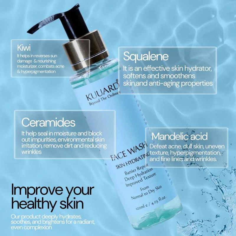 Kuuard Gentle hydrating face wash with Squalene, Ceramides, Kiwi, Fermented Rice Water, and Mandelic Acid that cleanses, hydrates, and helps maintain the skin barrier. Dermatologically tested, vegan, cruelty-free, paraben-free, and sulphate-free. Suitable for all skin types