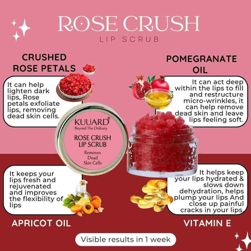 Kuuard Lip scrub with Sucrose, Crushed Rose Petals, Pomegranate Oil, Apricot Oil, and Vitamin E that helps remove dead skin, reduce dark lips, pigmentation, and smoker’s lines while keeping lips soft and nourished. Suitable for all lip types and regular use.