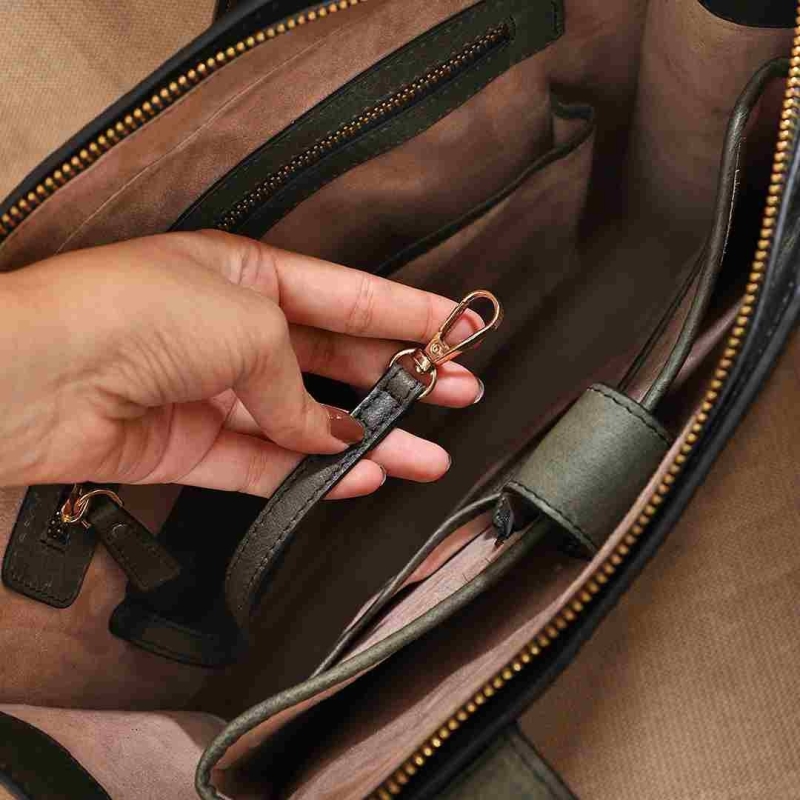 Inside, you’ll find an iPad pocket on the laptop compartment, a zipper pocket for valuables, a hanging key holder to keep your keys accessible, 4 slots for cards, a utility pocket, and a miscellaneous patch pocket for other items. Additionally, a discreet hidden inseam pocket on the outside edge provides extra security for your belongings.