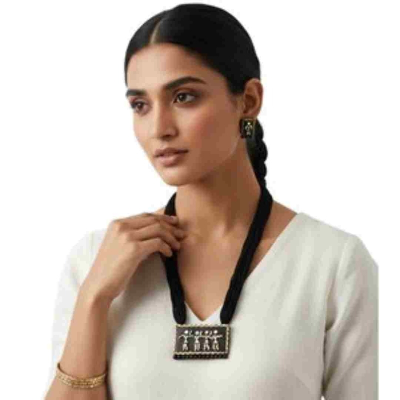 Enhance your style with this beautifully handcrafted terracotta jewelry set, designed by skilled artisans to bring together tradition and modern elegance. Each piece is uniquely made, ensuring that no two sets are exactly alike—giving you a truly exclusive accessory. Crafted from natural terracotta clay, this eco-friendly jewelry set is a perfect choice for conscious fashion lovers. Despite its bold and artistic appearance, the necklace and earrings are lightweight and comfortable, making them ideal for all-day wear. This versatile set complements casual outfits, ethnic wear, and festive attire, making it a must-have addition to your jewelry collection. Whether you're dressing up for a special occasion or adding charm to your everyday look, this set delivers effortless elegance. It also makes a thoughtful and artistic gift for birthdays, anniversaries, festivals, or any special moment. Each piece reflects a blend of traditional craftsmanship and contemporary design, making it both stylish and meaningful.