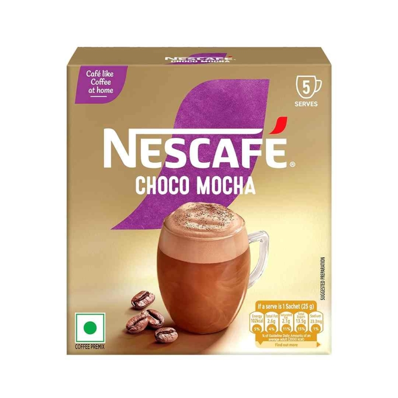 NESCAFÉ Choco Mocha Premix is a rich and indulgent instant beverage crafted to deliver a café-style chocolate coffee experience at home in just minutes. Manufactured by Nestlé India Limited, this 125 g pack contains 5 single-serve sachets (25 g each), ensuring freshness and convenience with every cup. Blended with medium-roast coffee and smooth chocolate flavor, it creates a frothy, aromatic Choco Mocha that balances the boldness of coffee with the sweetness of cocoa. Designed for effortless preparation, simply adding hot water transforms the premix into a creamy, café-like drink perfect for relaxation or a quick energy boost. The product reflects NESCAFÉ’s global expertise in coffee craftsmanship, offering a consistent and satisfying taste experience every time. Suitable for vegetarians, this premix is ideal for coffee lovers who enjoy a sweet, chocolate-infused twist to their daily coffee ritual.